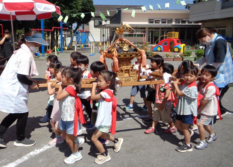 中でも創立70周年記念式に寄贈された子ども本神輿は本園の特徴のひとつで、毎年夏祭りに園児たちが元気に担いでおります。
