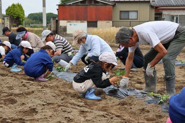 5月25日(木曜日)、地域の方からお借りした畑で、2年生が生活科の授業で栽培するサツマイモの苗植えをしました。三野谷地区区長会、栄寿クラブ、青少年対策委員会、PTA、三野谷公民館の方々から苗の植え方を教えていただき、一本一本ていねいに植えました。秋の収穫が楽しみです。