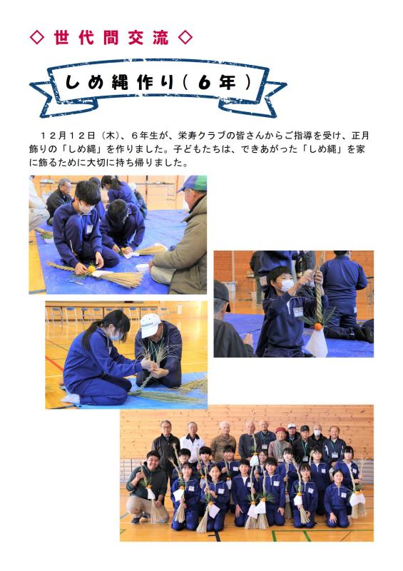 12月14(木曜日)、6年生が、栄寿クラブの皆さんからご指導を受け、正月飾りの「しめ縄」を作りました。子どもたちは、栄寿クラブのみなさんから毎年いろいろなことを教わり、貴重な体験をたくさんすることができました。