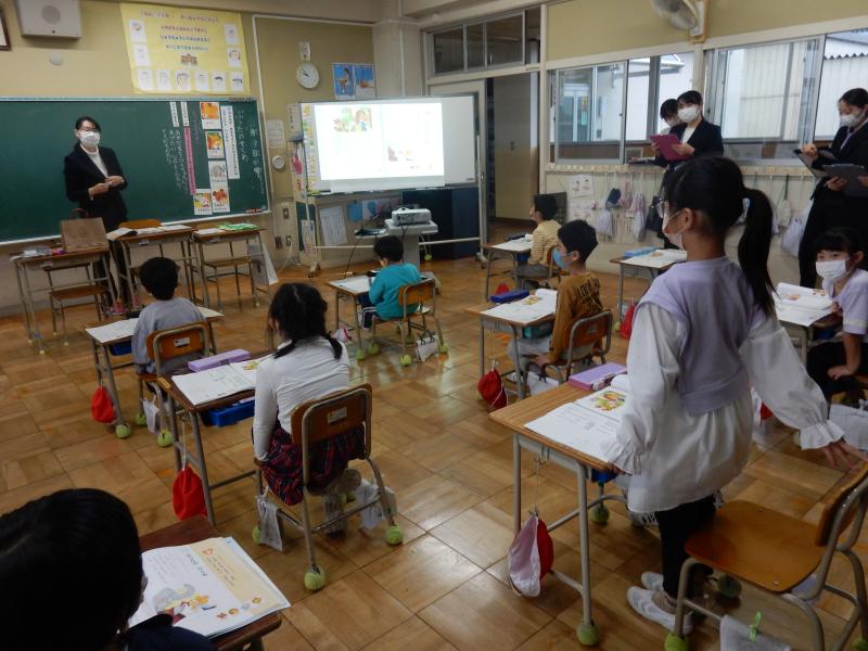 話す聞くの授業で、友達にインタビューをして、その内容をニュースキャスターになって伝えるという学習を行いました。たくさんの先生が見ている中での発表でしたので、みんな少し恥ずかしそうでした。