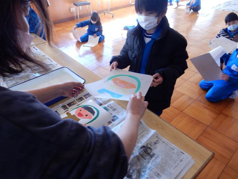 水で濡らした版画紙を段ボール版に貼り合わせると、不思議なことにカラフルな版画が完成します。子ども達は丁寧に版を刷り合わせ、仕上げることができました。