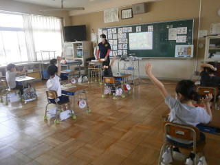 1学期の音楽は大きな声で歌うことができませんでしたので、音楽に合わせて楽しく体を動かして、リズム感を身に付ける授業を中心に行いました。