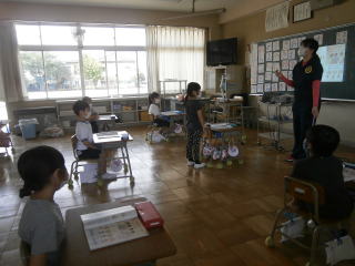 地域の方と一緒に楽しく童謡を歌ったり、リズムに合わせてみんなで体を動かしたりしました。授業の最後は、1・2年担任の二人の先生の生演奏をみんなで鑑賞しました。