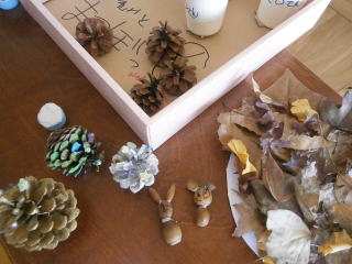 秋に拾った松ぼっくりやドングリでおもちゃを作って、一緒に遊ぼうという企画で東幼稚園の年長さんを招待しました。みんな興味津々で1年生に遊び方を教わりながら、とても楽しい交流ができました。