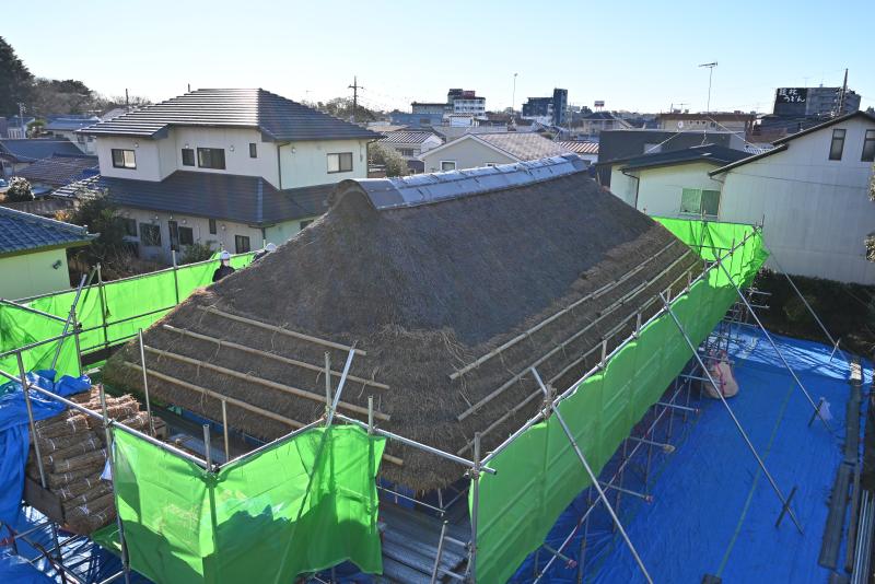 今回の工事は全面差茅工事です。傷んでいない茅を再利用する、昔ながらの工法です。